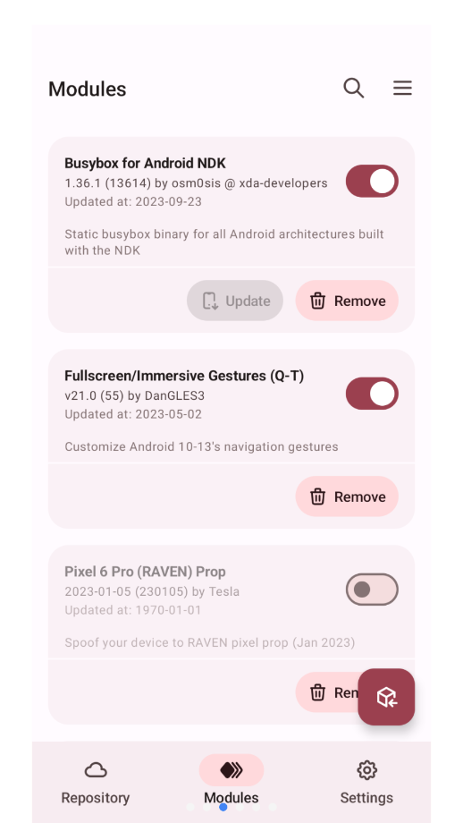 Mrepo模块仓库免费版是一款为安卓用户提供丰富模块资源的软件。它犹如一个宝藏库,汇聚了众多精心制作的模块,能极大地拓展安卓设备的功能与个性化定制空间。用户通过它可以轻松获取各类实用且有趣的模块,让手机展现出独一无二的魅力。